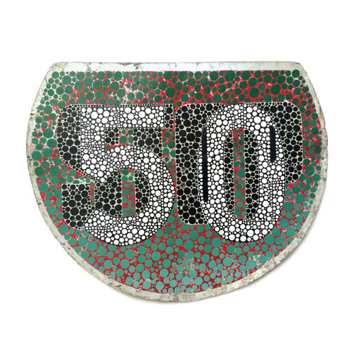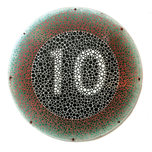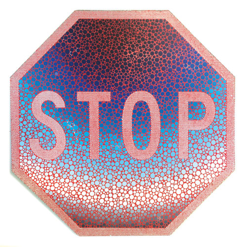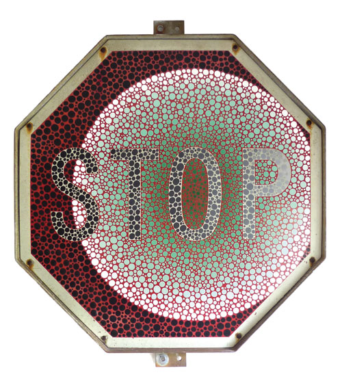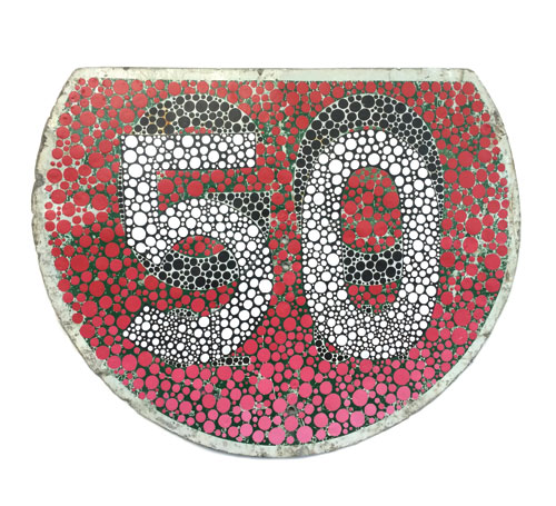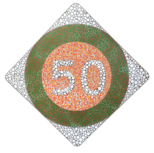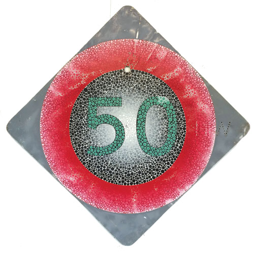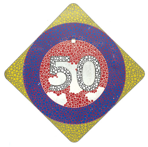 It is impossible to resist the urge to decode these works and their translation from linguistic to visual expression. The imagery appears flirty at first glance but the underlying intent becomes apparent when viewing them en masse. ‘Stop-50’ and ‘Go-50’ a crossroads, fits and starts, the ‘lollipop’ authoritarian safety sign transforming from its original commanding intent, transposed now to the epic minefield of hormonal fluctuations. The male urge to flee from such discussion will be replaced by a need to investigate further, enhanced by Jo’s relinquishing the idea of overcoming the artistic male domain, instead contentedly settling (with occasional outbursts) firmly into the space her prolific and experienced artistic expression afford her. None of her quirkiness is lost here, just a realisation within the works themselves that the artist is truly connected and at peace with her self.